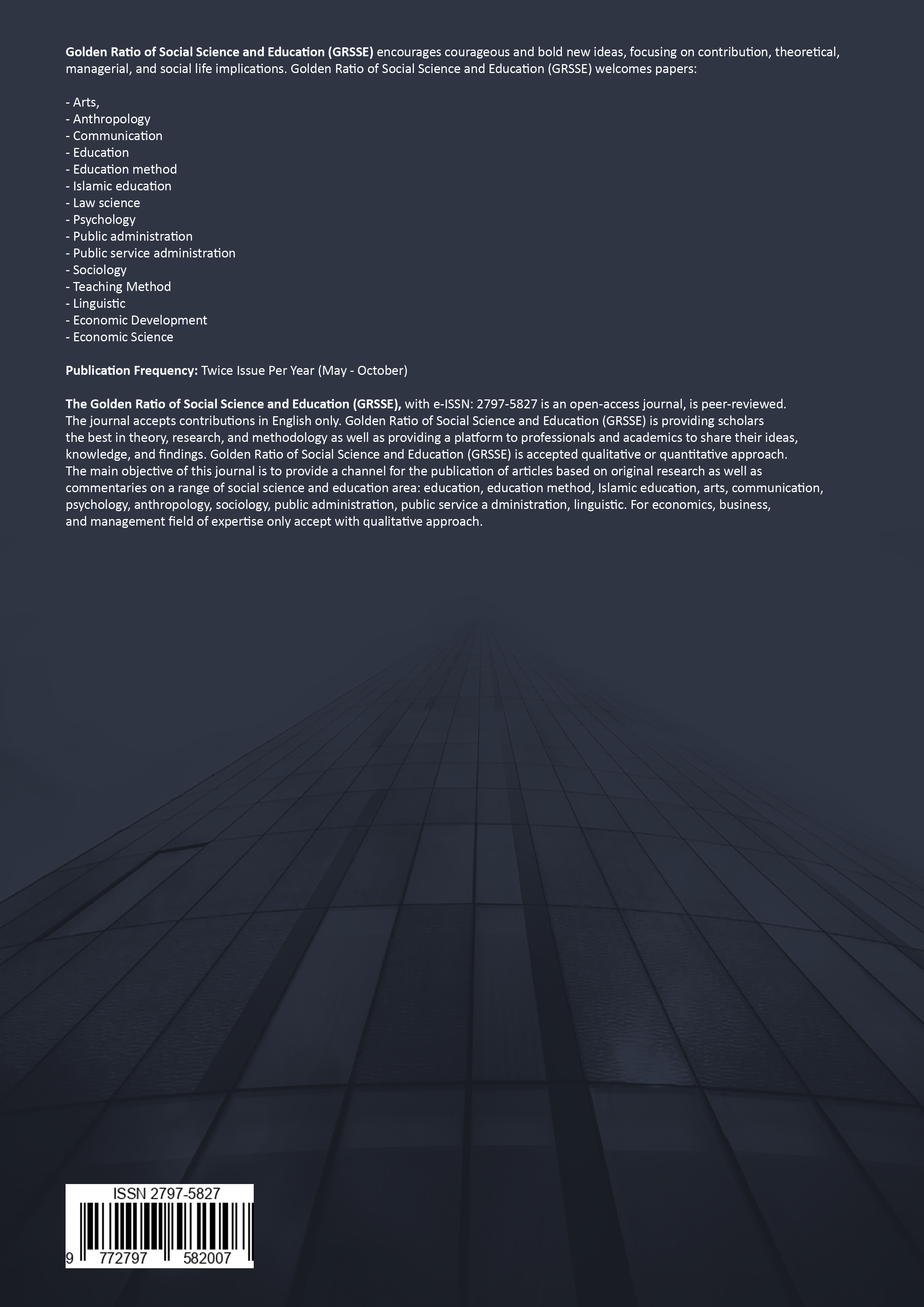 The Golden Ratio of Social Science and Education, with e-ISSN: 2797-5827 is an open-access journal, is peer-reviewed. The journal accepts contributions in English only. Golden Ratio of Social Science and Education is providing scholars the best in theory, research, and methodology as well as providing a platform to professionals and academics to share their ideas, knowledge, and findings. Golden Ratio of Social Science and Education are accepted qualitative or quantitative approach. The main objective of this journal is to provide a channel for the publication of articles based on original research as well as commentaries on a range of social science and education area: education, education method, Islamic education, arts, communication, psychology, anthropology, sociology, public administration, public service administration, linguistic. For economics, business, and management field of expertise only accept with qualitative approach.